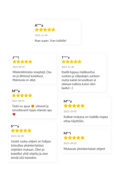 Jotta pystyt edistämään kehosi toimintaa ravinnon avulla, tarjoamme sinulle yhteistyön kautta saamamme huippusuositun reseptikirjan sekä itsekirjoittamamme toisen reseptikirjan (e-kirjoja), joiden avulla pystyt valmistamaan helposti ja nopeasti terveellisiä, maistuvia ja kiireiseen arkeen sopivia aterioita.